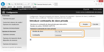 Introduzca el nombre del par de claves y la contraseña y, a continuación, haga clic en [Aceptar].