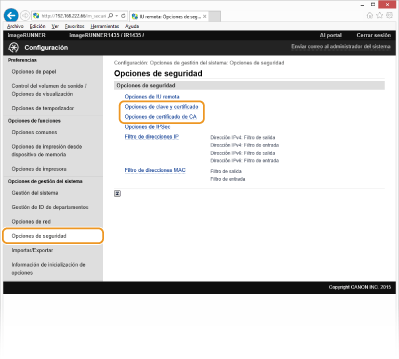 [Opciones de clave y certificado] (para los pares de claves) u [Opciones de certificado de CA] (para los certificados de CA).