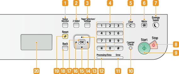 Press to check the status of copying and view the usage history. You can also check the status of the machine, such as the remaining amounts of paper and toner, or whether any errors occurred.