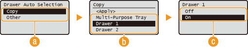 Enable or disable the automatic drawer selection feature for the paper sources. If automatic drawer selection is set to <On> when copying documents or printing lists, the machine automatically selects a paper source that is loaded with the appropriate paper size. Also, when the paper runs out, this setting enables continuous printing by switching from one paper source to another that is loaded with the same paper size.