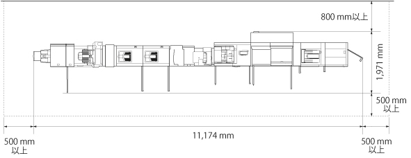 また、天地トリマー・A1、トリマー・D1、フィニッシャー・AN1、サドルフィニッシャー・AN2、ペーパーフォールディングユニット・J1、パーフェクトバインダー・E1、インサーター・N1、PODデッキ・D1、重連用PODデッキ・D1、PODデッキライト・C1、大容量スタッカー・H1を設置するときには、各機器の連結部に5 mmの隙間が必要です。