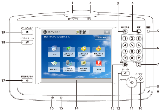 18. | カスタムメニューキー カスタムメニューとして登録した、よく使用する機能の設定を呼び出すときに押します。また、認証機能を使用している場合には、ユーザーごとに設定したカスタムメニュー画面を表示させることができます。(→カスタムメニュー) |