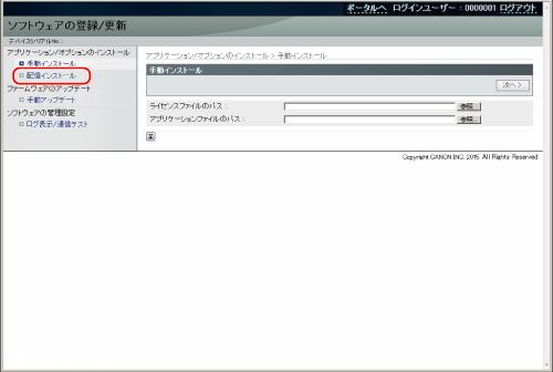 リモートUI のトップページから、[設定/登録]→[ライセンス/その他]→[ソフトウェアの登録/更新]をクリック