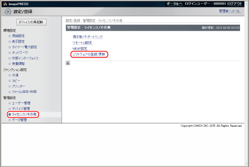 リモートUI のトップページから、[設定/登録]→[ライセンス/その他]→[ソフトウェアの登録/更新]をクリック
