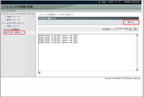 [ソフトウェアの管理設定]→[通信テスト]を押す
