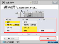 1つのトレイを、複数の機能の排紙先として設定することもできます。 選択したトレイの順に排紙先の優先順位となります。優先順位は、「1」、「2」と表示されます。 |