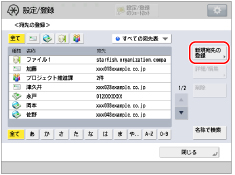 宛先の検索をするには、ここで入力したフリガナをもとに検索を行います。検索には、フリガナの1文字目をもとに宛先を限定して並べ替えをする方法や、半角24文字までのカタカナ、記号を使用して宛先を絞り込む方法があります。 名称での検索については、「こんなことができます」を参照してください。 |