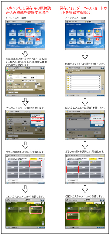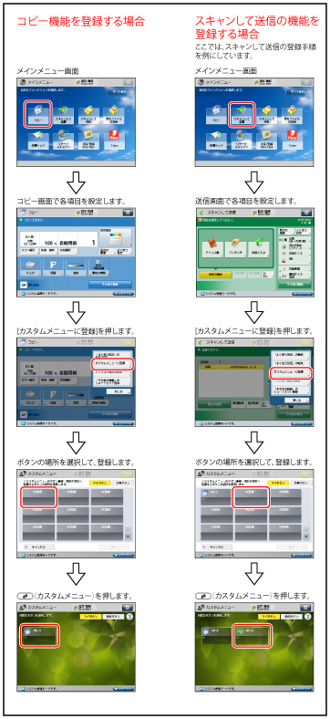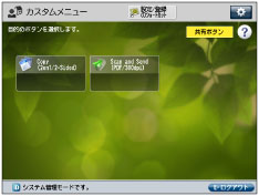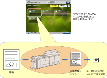 カスタムメニューは、日常のオフィスにおいて本製品の機能を使用した定型的な業務を効率化するための機能です。コピー、スキャンして送信、スキャンして保存などでよく使用する機能設定を1つのボタンとして作成、登録することができます。