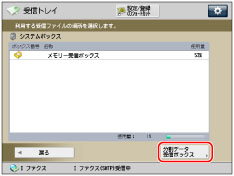 Iファクスの分割データの受信は、分割データを受信してから24時間を経過するとタイムアウトとなり受信できなくなります。タイムアウトの設定は、 「受信トレイを設定する」を参照してください。 暗証番号を求められた場合は、[受信トレイ設定]の[システムボックス暗証番号]で登録した番号を入力してください。 (→受信トレイを設定する) |
