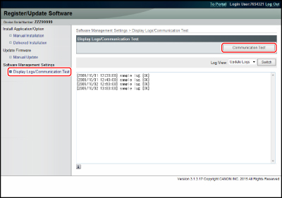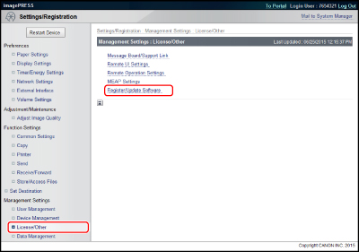 Press [Management Settings] → [License/Other] → [Register/Update Software].