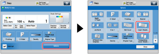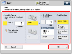 You cannot select [Sheets] and [Chapter Pages] at the same time. Before feeding paper from the Document Insertion Unit-N1, load paper into the Document Insertion Unit-N1 and specify the paper size. To specify the number of tabs, load tab paper into the Document Insertion Unit-N1 and select [Tab], and then press [No. of Tabs]. |