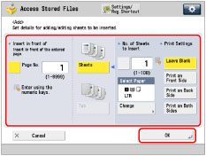 You can insert a total of up to 100 sheet insertions or chapter pages. If you are using paper that already has printing on it (e.g., company logo) as your sheet insertion, then you must select [Leave Blank]. Otherwise, the machine will print on the preprinted paper. The paper deck which is already specified as the paper source cannot be selected in the Automatic Paper Selection mode. |
