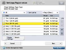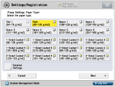 You can register paper types if paper types for the loaded paper are not displayed on the detailed setting list. For instructions on registering paper types, see "Overview of This Function." While you are registering the custom paper type for a paper source, the paper type settings are protected and you cannot change the detailed information for custom paper type or delete the custom paper type in [Paper Type Management Settings] in [Preferences] (Settings/Registration). |