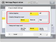 If you increase <Graphics Recognition Level>, the data size also increases. It is recommended that you first use [Normal], and if desirable results are not obtained, try increasing the recognition level to [Moderate] or [High]. |
