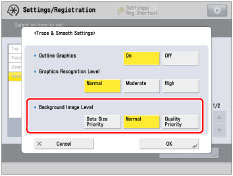 [Normal]: | The data size and background image quality are in between those of [Data Size Priority] and [Quality Priority]. |