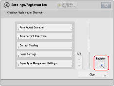 The [Settings/Reg.Shortcut] button can be displayed on the top of the screen or on the Main Menu screen. For more information, see