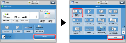 To copy multiple facing pages, scan the first pair of facing pages → place the next pair of facing pages of the original on the platen glass → press