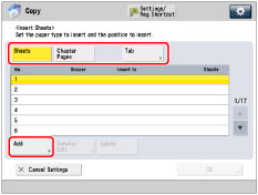 The settings are displayed in the order of insertion. You can confirm/change the settings for sheet insertions, chapter pages, or tab papers by pressing [Details/ Edit] after selecting the settings. To delete a sheet insertion, select the setting to delete → press [Delete]. Make sure that the Number of Tabs shown on the Tab Paper Print Shift Width Settings screen is the same as the number of tabs on the tab paper loaded in the paper source. |