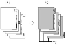 If you are copying on the sheet insertions, these sheets are included in the count of the total number of copies made. If these sheets are left blank, however, the machine's counter does not count them as copies. If you add chapter pages or tab papers, these sheets are included in the count of the total number of copies made. If you want to set both [Insert Sheets] and [Add Cover], select the same paper size. Tab paper is always copied on. If you do not want to copy on the tab paper, insert blank sheets of paper in each place where you want the tab paper to go. When copying on tab paper, check that the position of the tabs is correct. If you feed tab paper from the Paper Deck, the POD Deck Lite-C1, or the POD Deck-D1/Secondary POD Deck-D1, you must register the paper type in the paper source as tab paper beforehand. (See "Registering the Paper Size and Type for a Paper Source.") You can specify multiple paper source per job when feeding tab papers. For instructions on loading tab paper into the Paper Deck, the POD Deck Lite-C1, the POD Deck-D1/Secondary POD Deck-D1, or the Document Insertion Unit-N1, see "Maintenance." If [Unprocessed Tab Paper Forced Output] is set to 'On', the extra amount of tab paper sheets that were not required for the job are forced out of the machine. Example: If the number of tabs is set to 5 and the machine estimates that seven sheets of tab paper are needed for the copy job, you must prepare two sets of tab paper each containing five tabs (10 total). Therefore, if the machine only uses seven tab paper sheets, three tab paper sheets will remain. Areas of images shifted outside the tab paper cannot be copied on the paper, and may cause the following copies to have black streaks or appear dirty. Example: Areas of images may shift outside the tab paper. ![]() *1 Originals *2 Copies *3 Area Shifted Out |