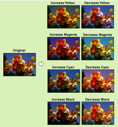 You can make fine adjustments to the colour by varying the relative strength and density of yellow, magenta, cyan, and black. The colour adjustments that you make can be stored and recalled for future use.