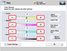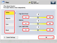 Select the colour that you want to adjust → press [-] or [+] to adjust the density level for the darker (high), medium, and lighter (low) density areas → press [OK].