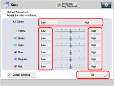 Press [Low] or [High] to adjust the saturation level of the selected colour or all the colours → press [OK].