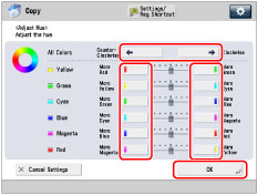 To adjust the hue level of each colour, press [More Red], [More Green], [More Yellow], [More Cyan], [More Blue], or [More Magenta] for each colour.