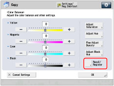 Specify the colour balance, saturation, hue, and density settings that you want to store → press [Recall/ Register].
