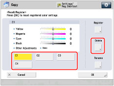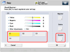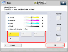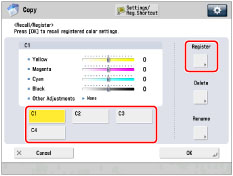 Select a key ([C1] to [C4]) for storing the colour balance settings → press [Register].