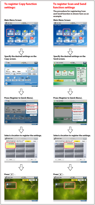 The Quick Menu is a function that increases the efficiency of operations that use functions of the machine for an office. You can create and register frequently used function settings such as Copy, Scan and Send, and Scan and Store in a button.