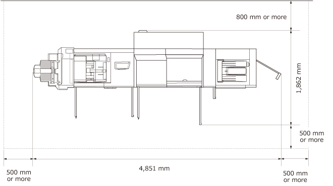 Also, for installing the Two-Knife Booklet Trimmer-A1, Booklet Trimmer-D1, Finisher-AN1, Saddle Finisher-AN2, Paper Folding Unit-J1, Perfect Binder-E1, Document Insertion Unit-N1, POD Deck-D1, Secondary POD Deck-D1, POD Deck Lite-C1, Multi Function Professional Puncher-A1, and High Capacity Stacker-H1, the space of 5 mm between each equipment is necessary to connect them.