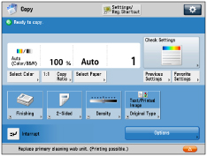 The cleaning web units in the primary and secondary fixing parts are replaced using the same method. This section explains the replacement method of the primary fixing part. The fixing part and the lever for pulling out the fixing part are shown in the figure below. ![]() *1: Primary fixing part (C-A4) *2: Secondary fixing part (C-B4) Prepare a new cleaning web unit before starting the replacement process. Press [Previous] and [Next] displayed on the touch panel display to review the replacement process. Jobs that are interrupted by replacing the cleaning web unit restart automatically after replacement is complete. |
