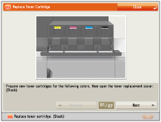 Complete instructions on how to replace the toner cartridge can be accessed by pressing [Previous] or [Next] on the touch panel display. If toner runs out during a print job, the remaining prints are made after you replace the toner cartridge. If black toner is left, you can continue copying and printing in black-and-white. However, if a job is interrupted because cyan, magenta, or yellow toner runs out, copying and printing in black-and-white is only possible for functions other than the function being used for the interrupted job. After replacing toner cartridges, if printed colours are different from the colours printed before you replaced the toner cartridges, perform [Auto Adjust Gradation] in [Adjustment/Maintenance] (Settings/Registration). (See "Automatic Gradation Adjustment.") |