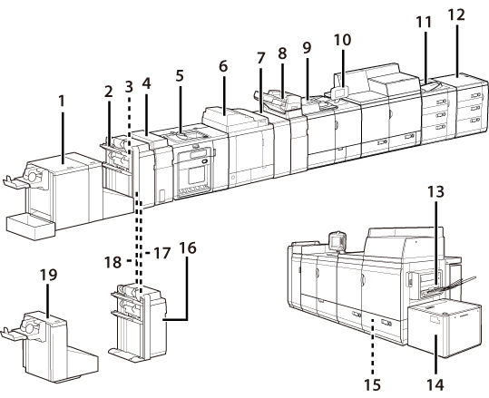 14. | POD Deck Lite-C1 If the POD Deck Lite-C1 is attached, it can provide an additional paper source. The POD Deck Lite-C1 holds up to 3,500 sheets of paper (80 g/m2). |