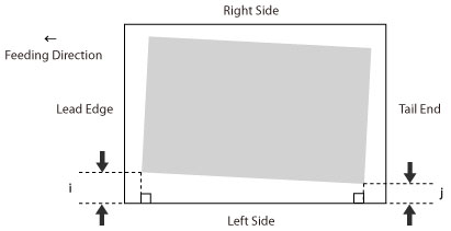 If the printed image is skewed, you may be able to correct the misaligned image by justifying margins of 'i' ,which is the distance from the left edge of the paper to the printing area, and 'j'.