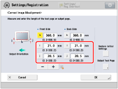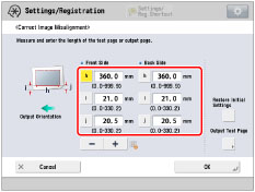 To restore the accumulated value, press [Restore Initial Settings]. If register marks are printed on the output paper, the printed area is equal to the area inside the register marks. |
