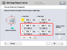 To restore the accumulated value, press [Restore Initial Settings]. If register marks are printed on the output paper, the printed area is equal to the area inside the register marks. |