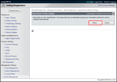 If you import the device settings, the Address List is also imported, causing the registered destinations to be deleted and overwritten with the destinations in the imported file. The machine must be restarted to enable the imported device settings. After importing, turn OFF the main power of the machine, and turn the main power back ON again. After importing device settings, the Remote UI cannot be used to perform other operations until the machine is restarted. Turn OFF the main power of the machine, and turn the main power back ON again. If the data exported from this machine is imported to a different model machine, [Favorite Settings] on the control panel is not updated. If you specify the address in the Remote Address Book as the forwarding destination, the forwarding settings will not be imported. However, if the machine, which exports setting information, and the target machine for importing use the same Remote Address Book, the forwarding settings can be used in the target machine for importing. For more information on the Remote Address Book, see (See "Specifying Destinations Using the Address Book (Remote).") |
