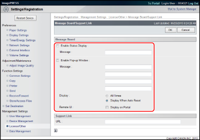 Click [Settings/Registration] → select [License/Other] from the menu that appears under Management Settings → click [Message Board/Support Link].