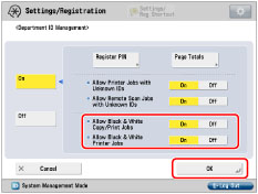 If you set <Allow Printer Jobs with Unknown IDs> to 'On', all print jobs are accepted. Therefore, the Allow Black Printer Jobs setting is ignored. If you want to use functions other than copy/print in the Black mode such as copy/print in the Auto (Color/Black) mode for [Select Color], scan and store in mail box, or scan and send, you must enter the Department ID and password. |