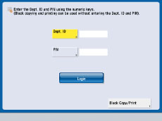 If you set <Allow Black & White Copy/Print Jobs> to 'On', [Black Copy/Print] appears on the screen for entering the Department ID and PIN.