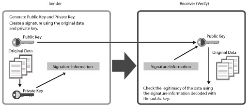 The structure of a digital signature is indicated below. By comparing the encrypted data from the sender with the public key, the receiver can check the legitimacy of the sender and data.