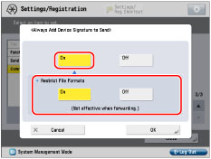 Press [Always Add Device Signature to Send] → [On] for <Always Add Device Signature to Send> → specify the setting for <Restrict File Formats>.