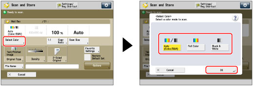If a black-and-white original is scanned in the Full Color mode, it is counted as a colour scan. You can register a desired colour mode as the default setting by changing the default scan settings. (See "Specifying the Scan and Store Settings.") |