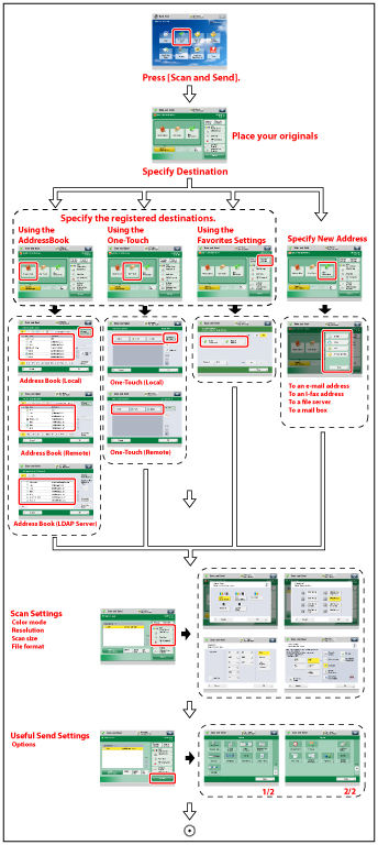 14 | [Options] Press to select and use other modes available for scanning and sending. Set useful send functions such as sending different sized originals together or sending 2-sided originals. |
