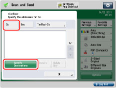 You can set multiple e-mail address destinations as Cc (Carbon copy) and Bcc (Blind carbon copy) addresses in addition to the destinations for the documents.