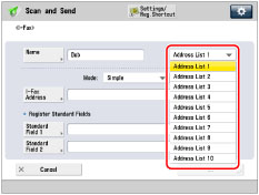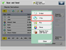 The first character that you enter for the name is used for sorting the destination list when you press keys, such as [ABC], [DEF], and [GHI], on the Address Book screen. If [Search by Name] is pressed on the Address Book screen, a screen for narrowing the search in the Address Book appears. |