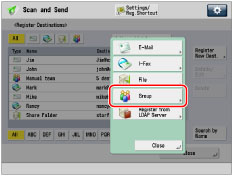 If you want to create a group address, the destinations to register (such as e-mail addresses and file server addresses) must be stored beforehand. |