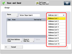 The Group Address feature enables you to create a group. You can register different types of destinations (such as e-mail, I-fax, file server, or mail box destinations) as a single group.