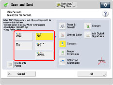 You can select additional settings if you send in the PDF, XPS or OOXML format. Refer to the following for instructions on setting each type of PDF, XPS, or OOXML: [Trace & Smooth]: Trace and Smooth [Compact]: Compact PDF or XPS [Limited Color]: Limited Colour PDF [OCR (Text Searchable)]: Searchable PDF/XPS/OOXML [Add Digital Signatures]: Adding a Digital Signature to a PDF or XPS [Encrypt]: Encrypting PDF Files |